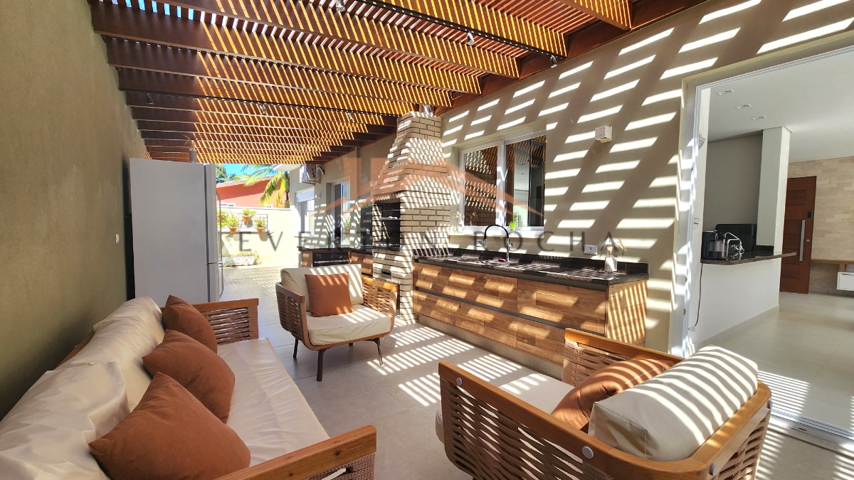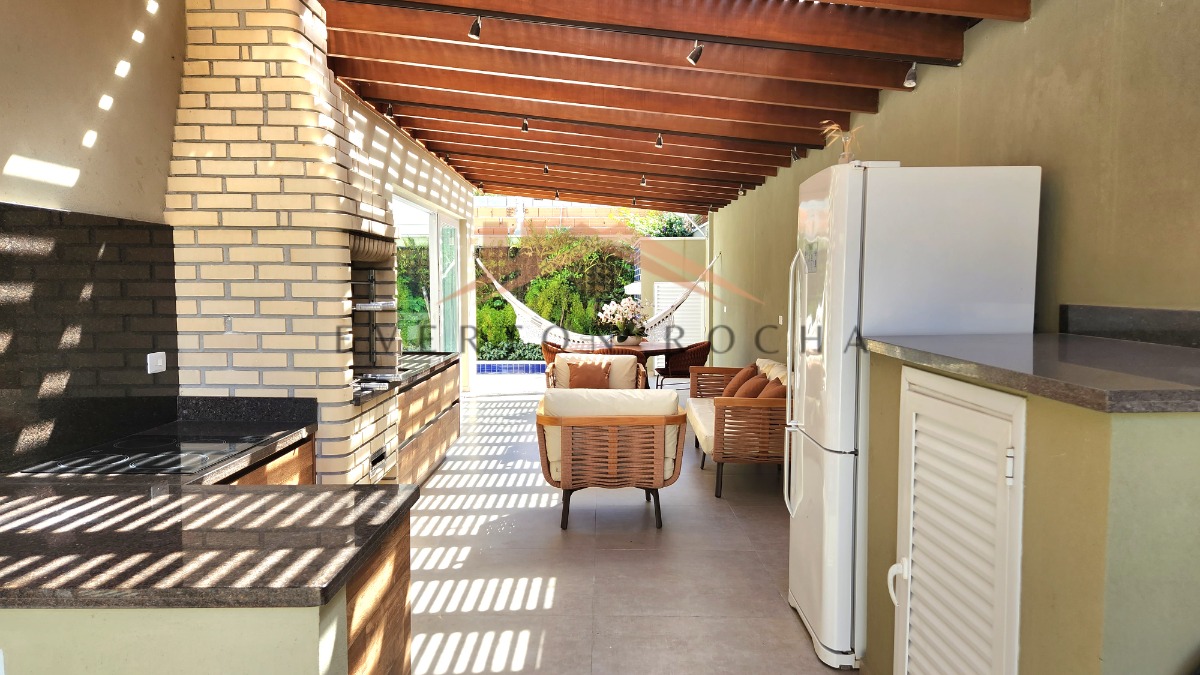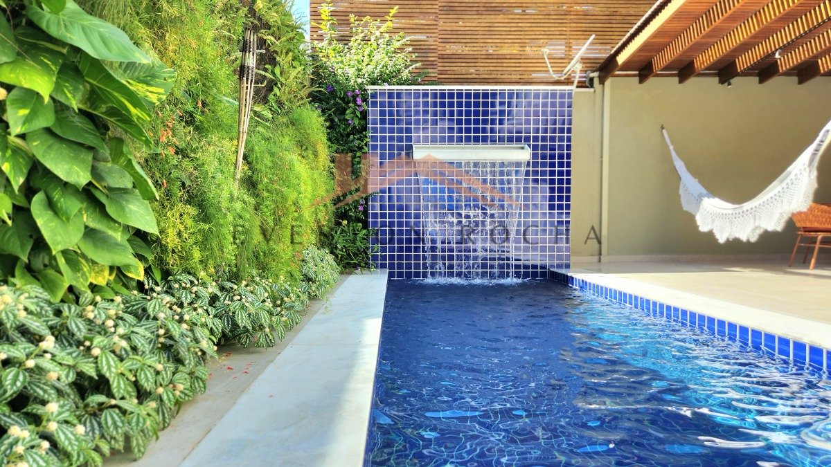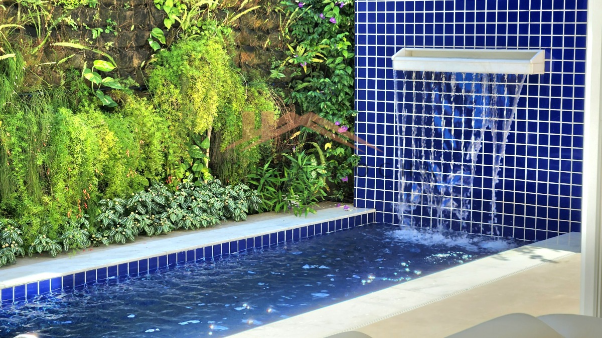 - Espaço gourmet com churrasqueira coberto com pergolado em madeira acompanhado de piscina privativa aquecida e com cascata.
