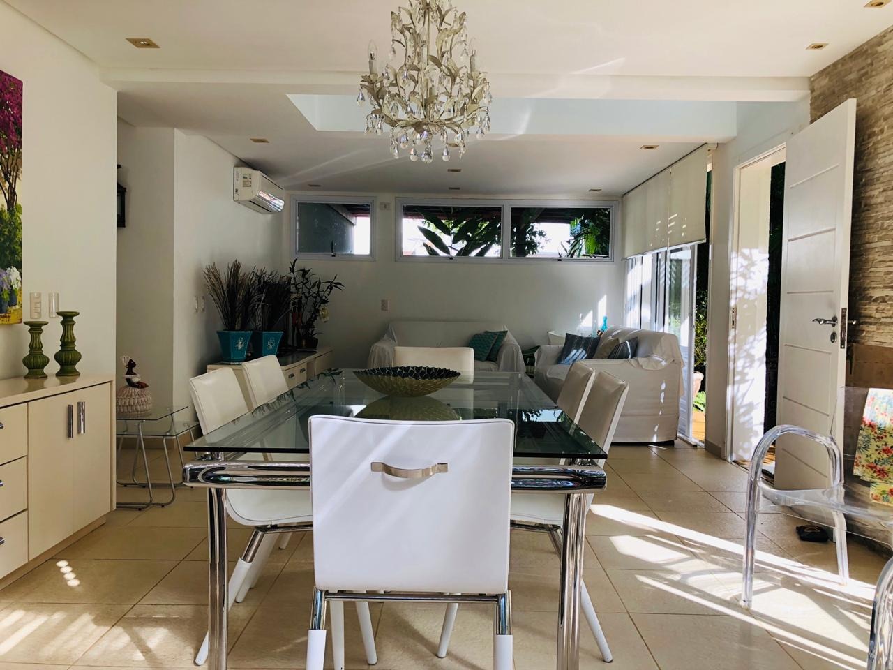 Casa em condomínio resort, com 4 suítes, sala de estar, sala de jantar, sala de TV, área churrasqueira, cozinha americana, quarto auxiliar térreo, banheiro, lavanderia, entrada de serviço e piscina privativa.