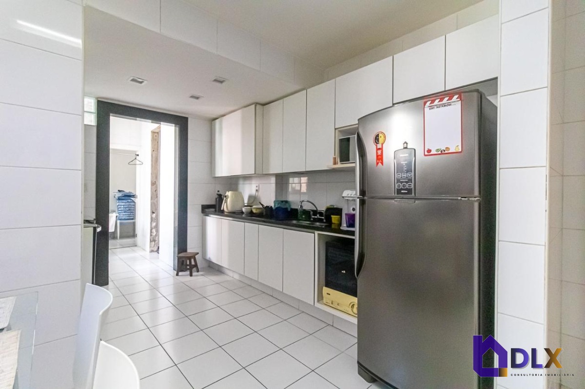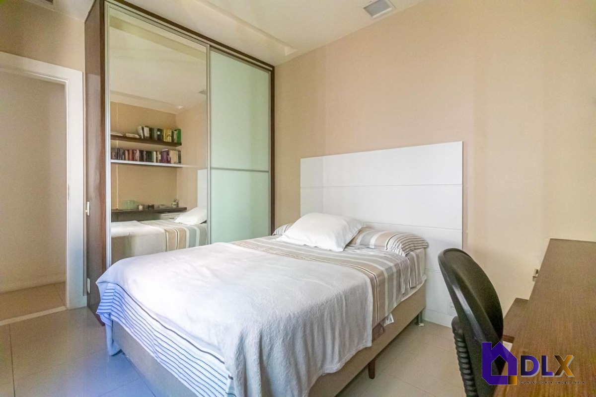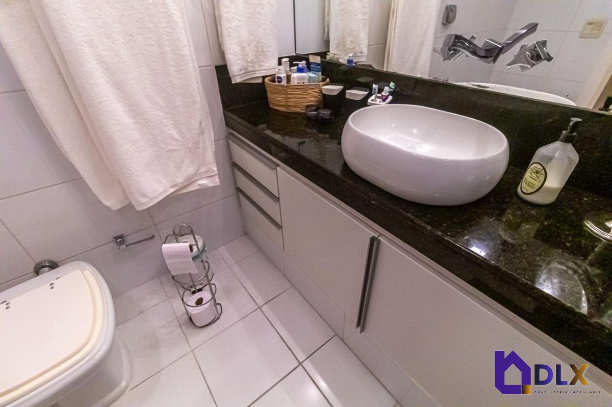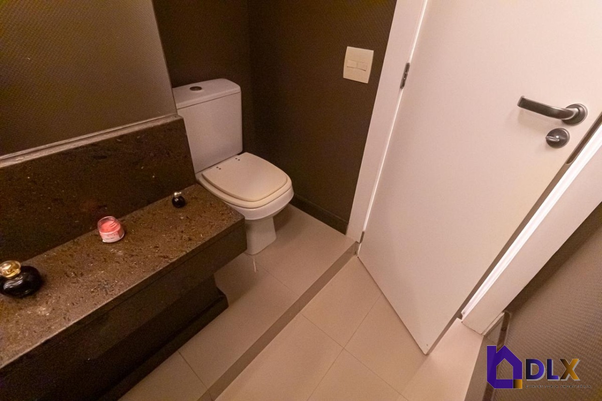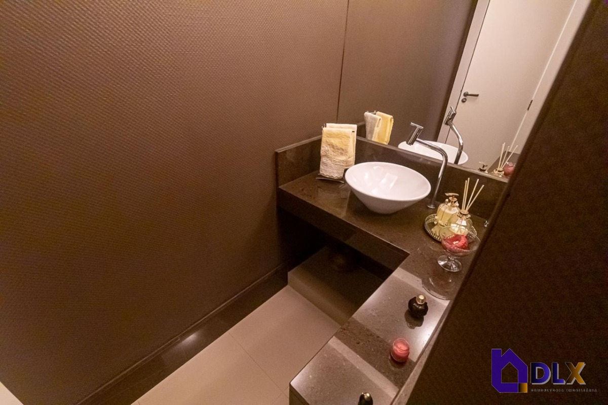 No piso inferior, o apartamento conta com sala ampla em dois ambientes, hall de circulação com armários, lavabo, copa-cozinha, área de serviço e dependência completa.