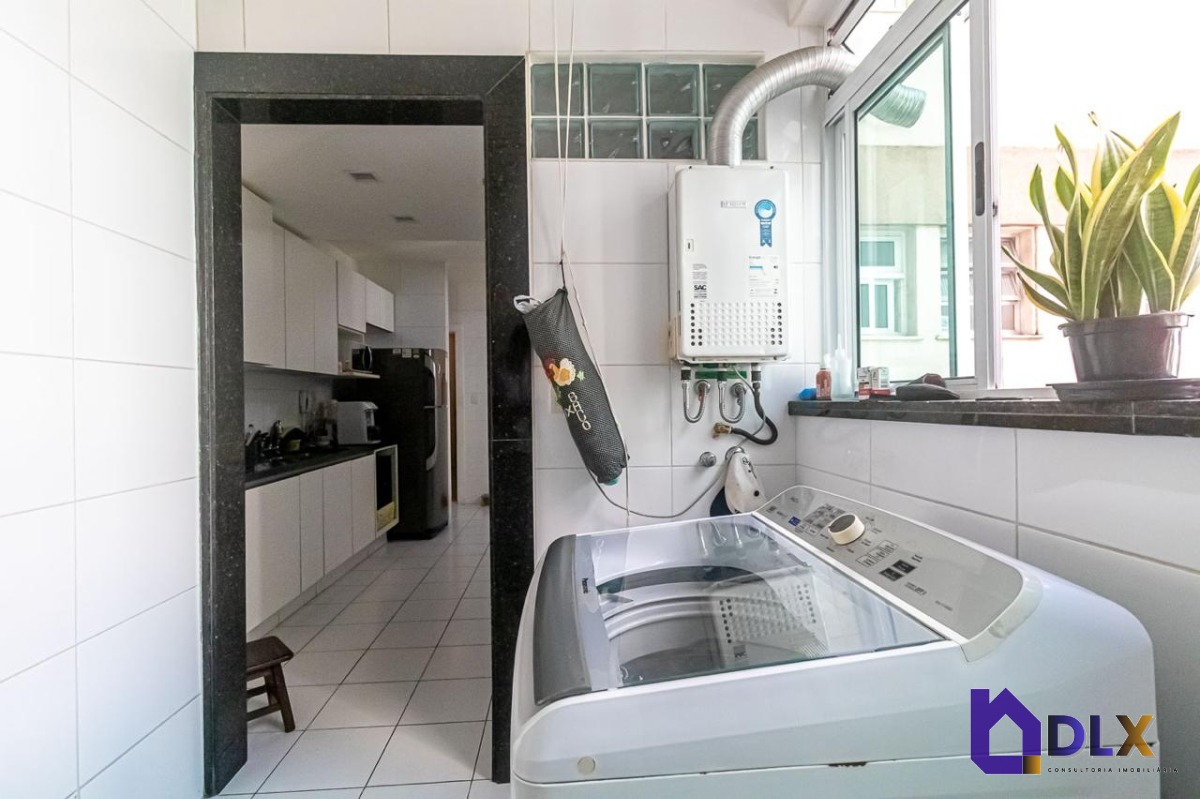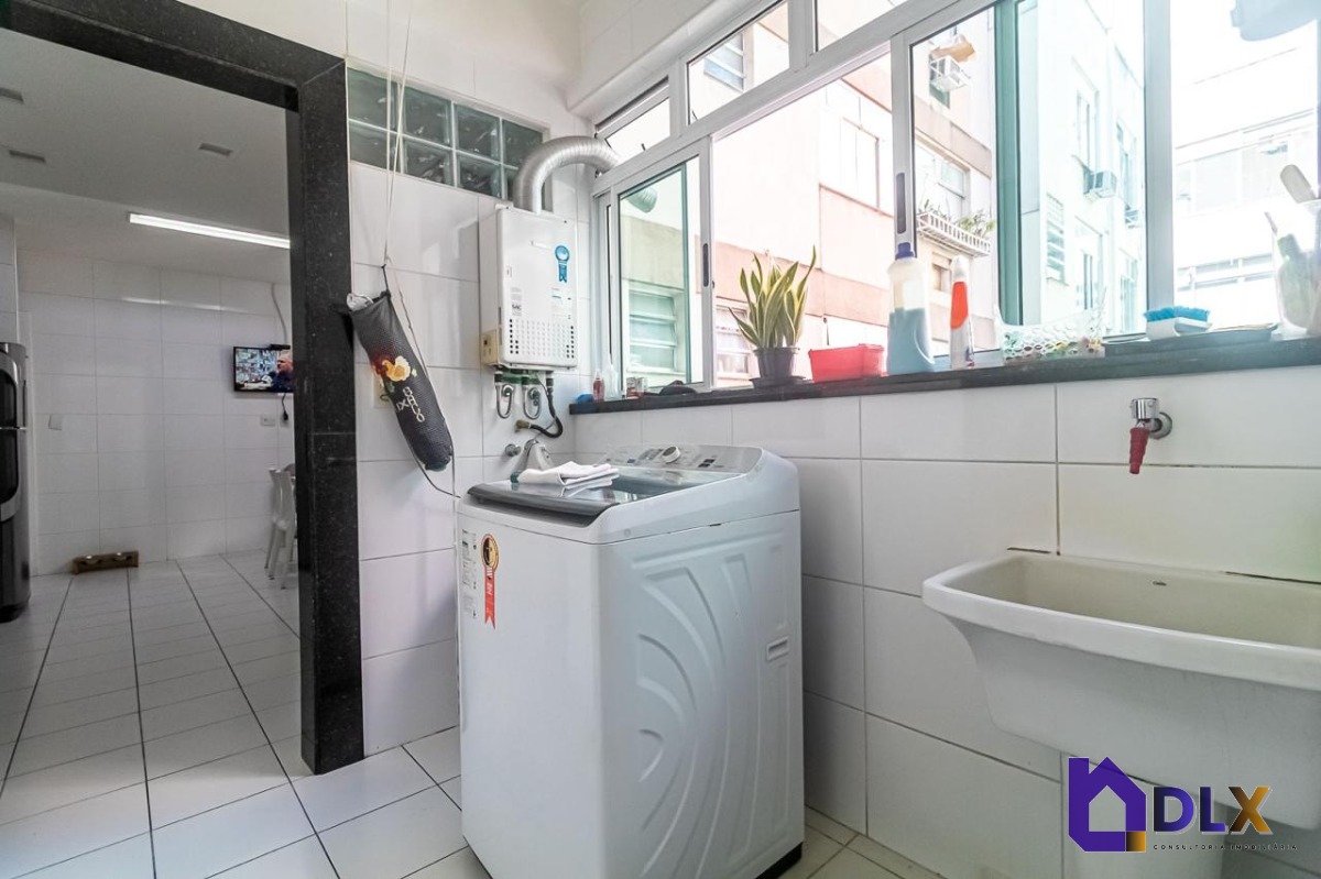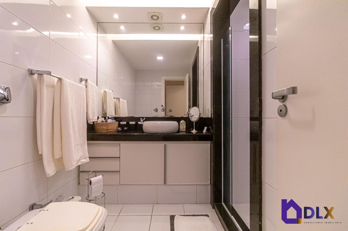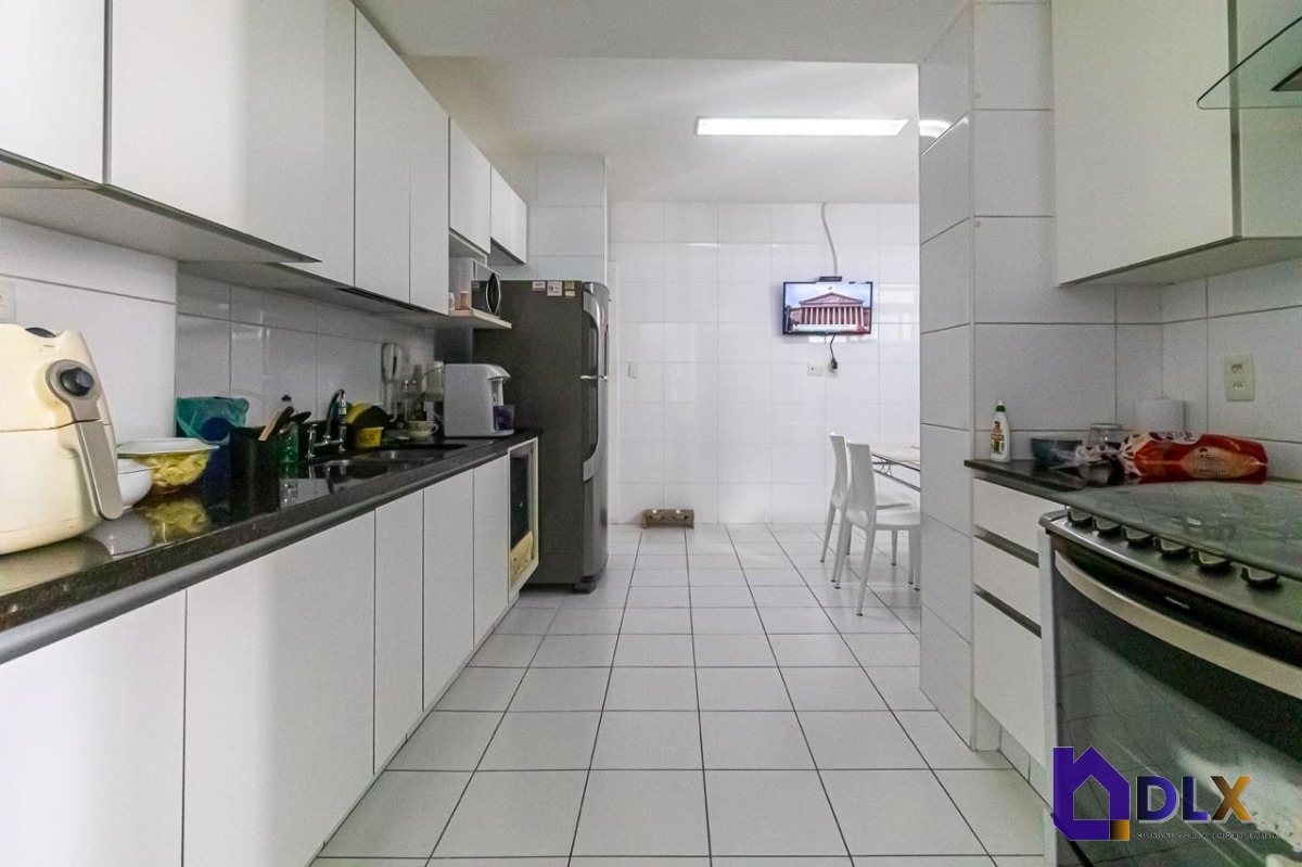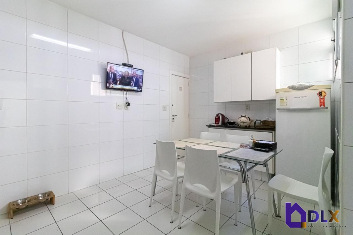 No piso inferior, o apartamento conta com sala ampla em dois ambientes, hall de circulação com armários, lavabo, copa-cozinha, área de serviço e dependência completa.