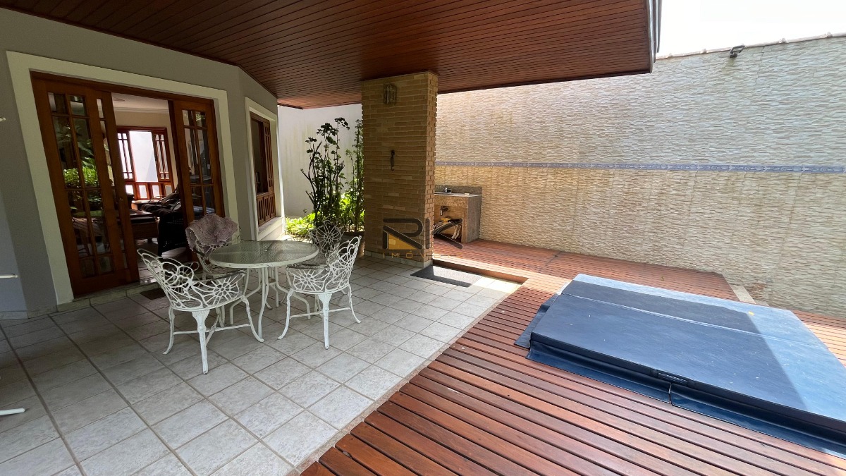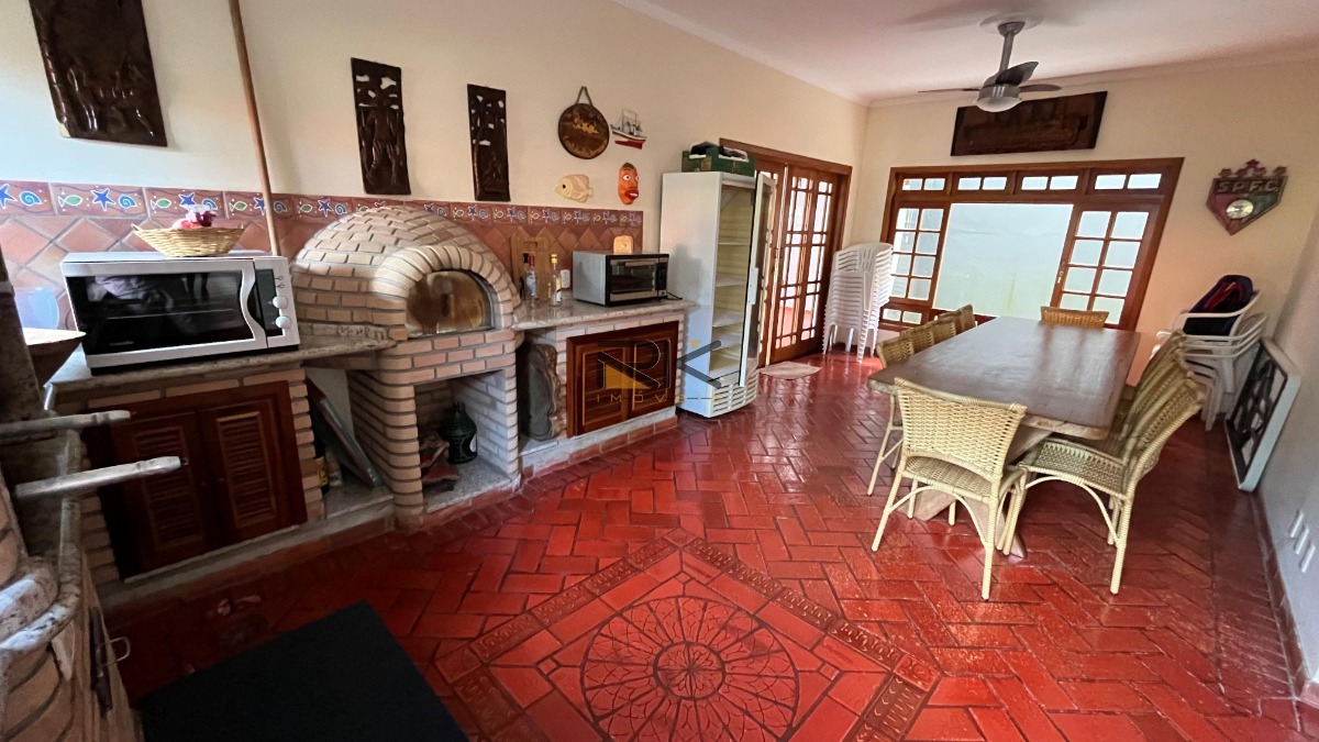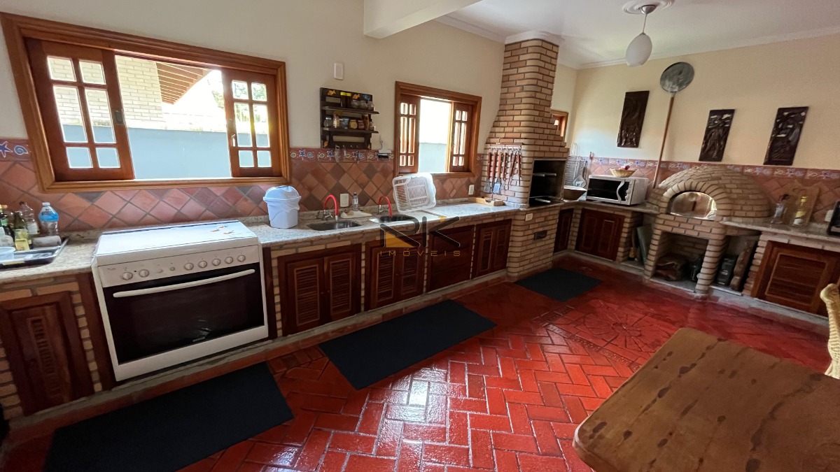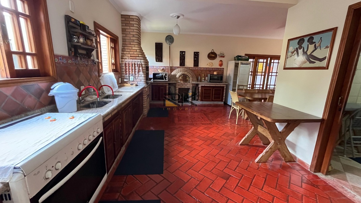 A cozinha, completamente equipada, é o coração da casa, onde a arte culinária se une à convivência. O espaço gourmet adjacente é um convite ao entretenimento, com churrasqueira, forno de pizza e fogão a lenha, perfeito para reuniões ao ar livre e festas animadas.